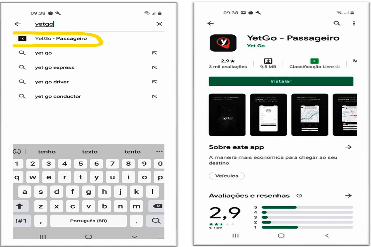 1. Na Play Store (Android) ou na App Store (Iphone), encontre, baixe e instale o aplicativo YetGo - Passageiro.