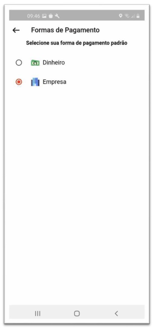 3. No cadastramento, se solicitado, ou depois, nas configurações, escolha a forma de pagamento padrão "EMPRESA". De outra forma o aplicativo não irá funcionar.