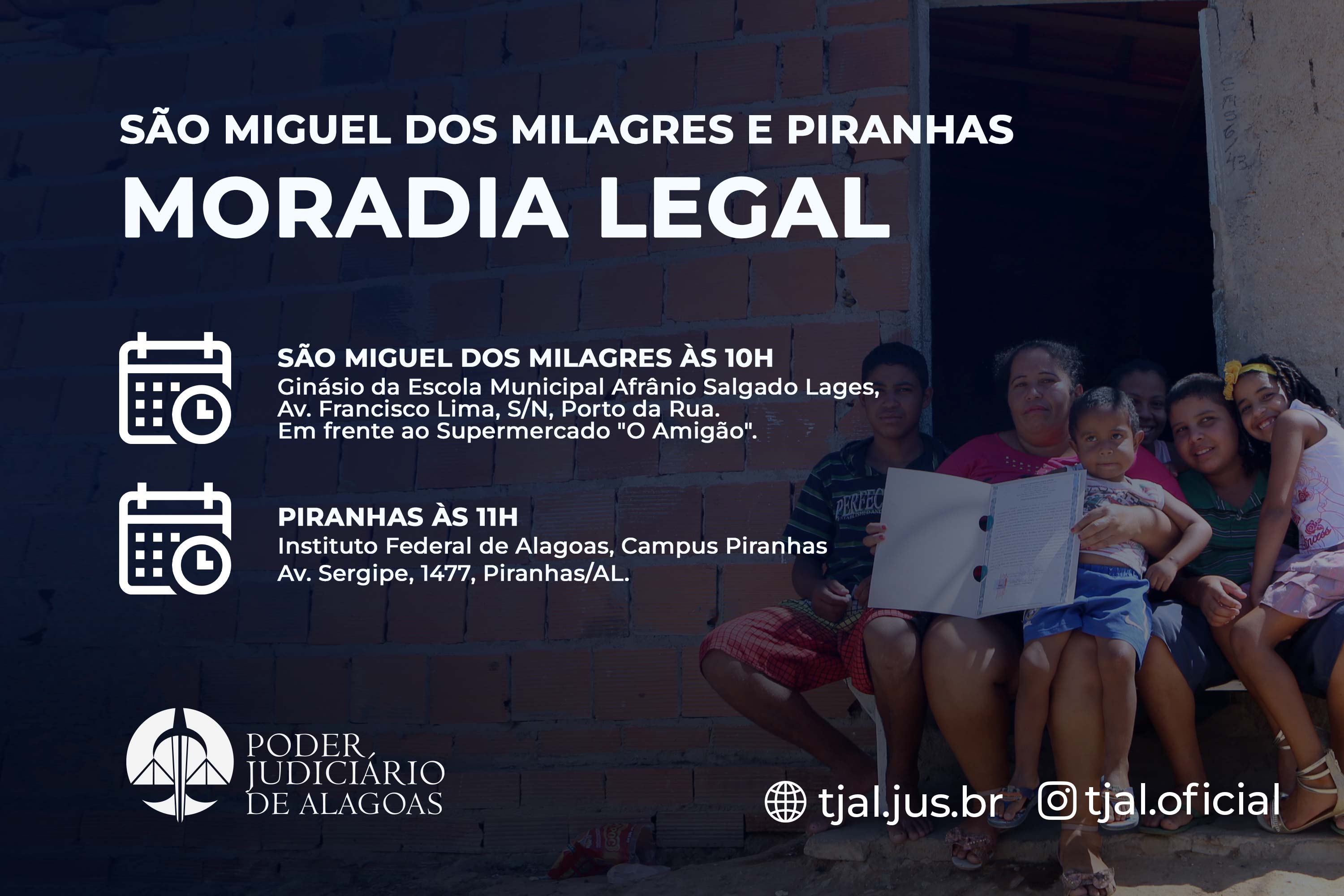 Programa de regularização fundiária do Judiciário alagoano acontece em São Miguel dos Milagres, às 10h, e em Piranhas, às 11h; população de baixa rend...